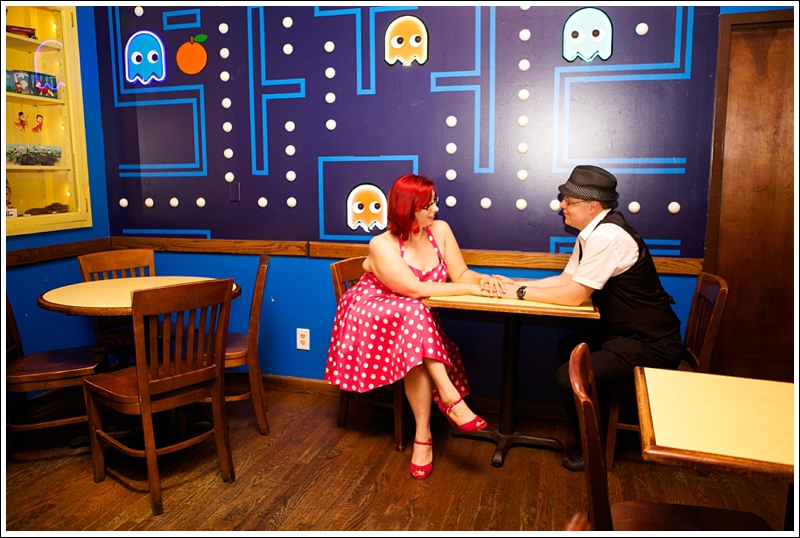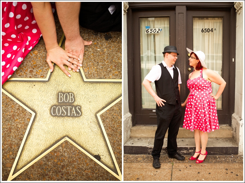 Fast forward to their engagement session, which took place on the Delmar Loop in St. Louis. They spent a lot of time there while dating and Tom proposed there so it was definitely the spot they wanted to take pictures at. There were 3 specific places that we stopped at. The first being the Tivoli Theater. It’s a landmark theater and it’s gorgeous. Kim even emailed them to make sure we could actually take pictures there. The second place we went was to Blueberry Hill, also a landmark but it’s a music club filled with pop culture memorabilia. They have so much inside of that thing! We took pics INSIDE the restaurant in the Pac Mac room and the entrance waiting area. Definitely a great time. The last place on the loop that we went to was Star Clipper, a comic book shop. Tom and Kim both LOVE Batman so it was one of their favorites spots to go to together.